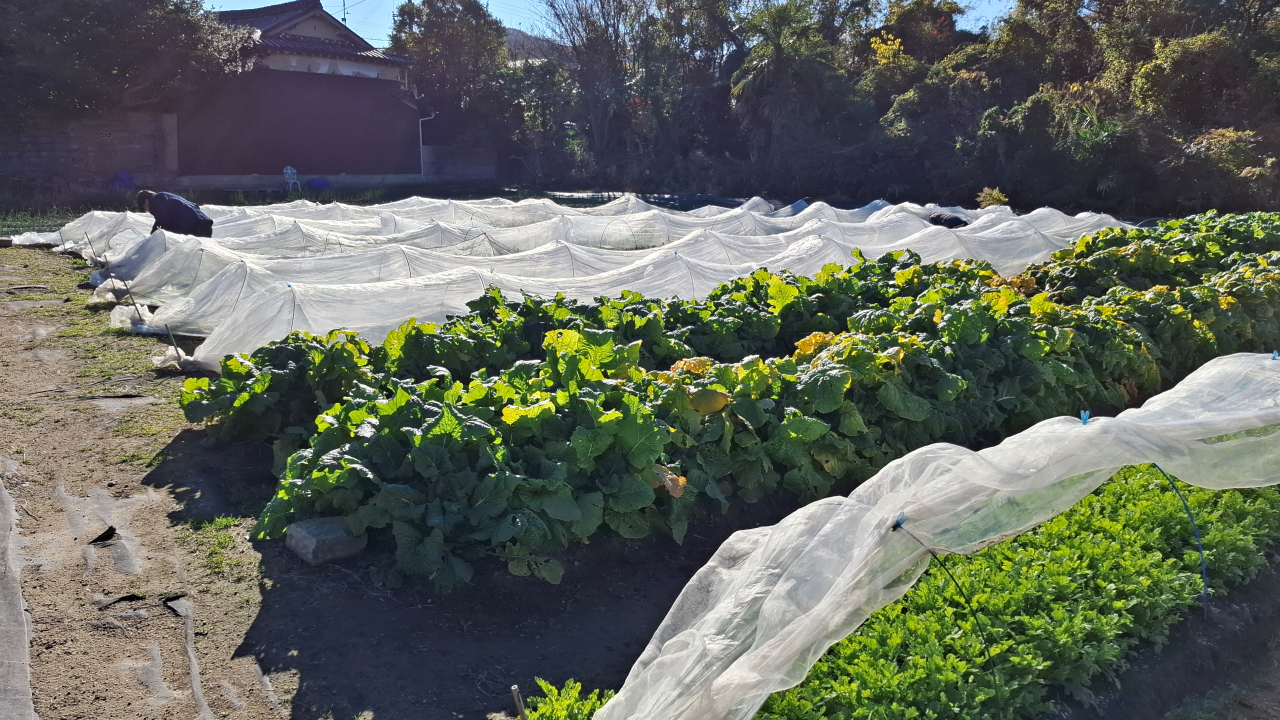 ほうれん草、春菊、花菜が植わっている状態で大きくなり次第順次収穫している状況です。